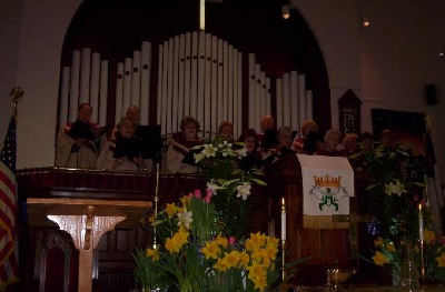 In order, here are the pictures -- Up front in church were children and youth celebrating the end of the Sunday School year (until we return in September). Three pictures of the Keri, Caeden and Nick drumming at a service. Stanhope Boro Clean-up Day with church volunteers, Easter Day (five in a row),the Good Friday Cross walk, entering St. Michael RC Church. The cross walk began at our church -- here is Rev. Matlack and Carol Barry, piper. Then -- the front of the church, at 100 Main Street, Stanhope. Our sanctuary at Easter, with the choir singing. Hugh Matlack, having climbed up the CE Building roof to check out our new solar panels. The communion table again on Easter Day. Good Friday Ecumenical Walk. The last picture below is Easter Sunrise Service.